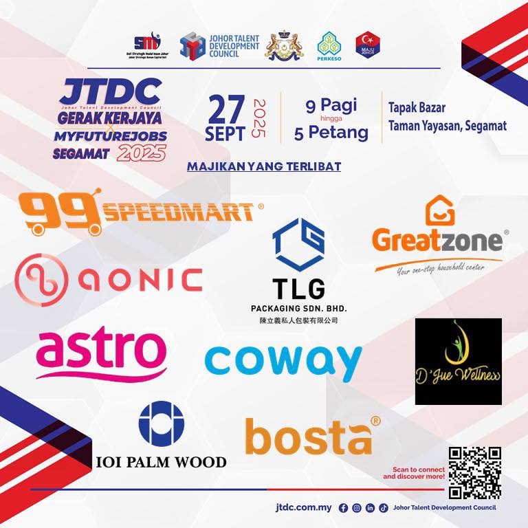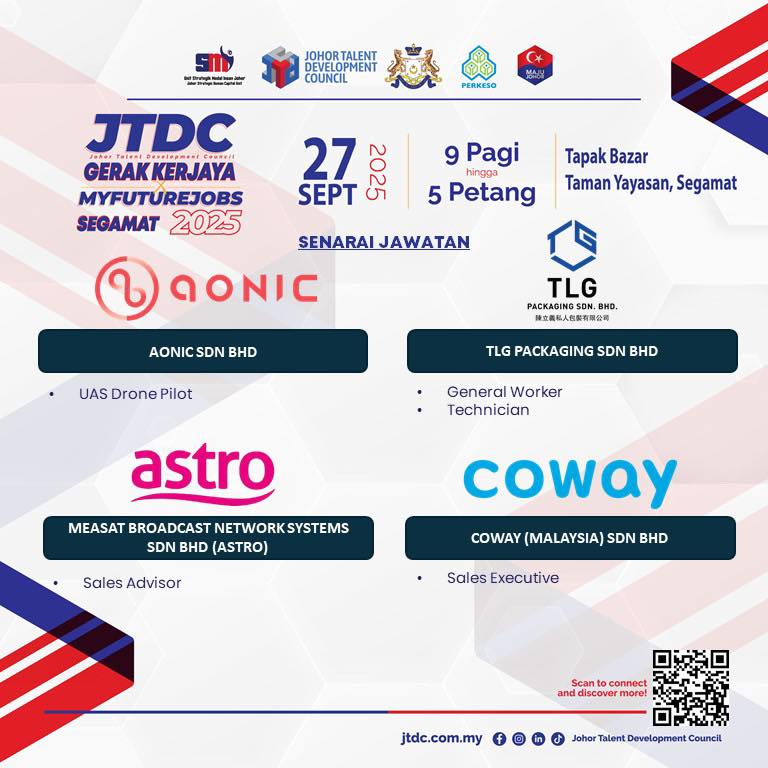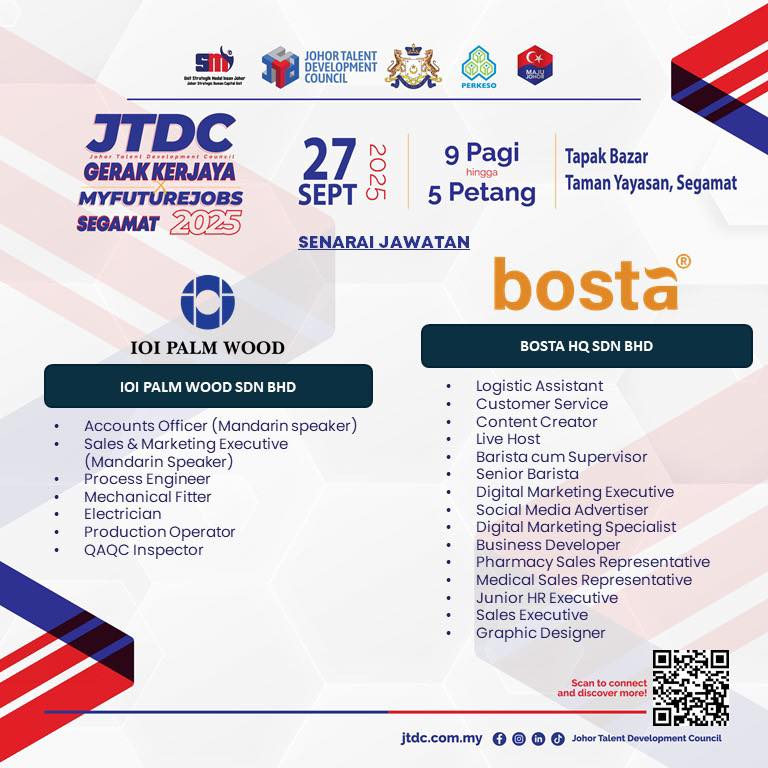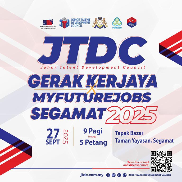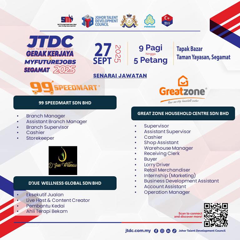 Jom sertai 𝐉𝐓𝐃𝐂 𝐆𝐄𝐑𝐀𝐊 𝐊𝐄𝐑𝐉𝐀𝐘𝐀 𝐗 𝐌𝐘𝐅𝐔𝐓𝐔𝐑𝐄𝐉𝐎𝐁𝐒 𝐒𝐄𝐆𝐀𝐌𝐀𝐓 𝟐𝟎𝟐𝟓 SEMPENA JELAJAH ORANG JOHOR (JOJ) DUN BULOH KASAP dengan pelbagai tawaran jawatan menarik menanti anda.